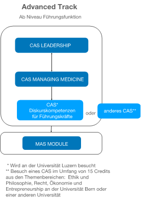 Der «Advanced Track» besteht aus dem «CAS in Leadership in Health Care Organisations, Universität Bern», «CAS in Managing Medicine in Health Care Organisations, Universität Bern», sowie dem CAS LEAD, Universität Luzern. Wahlweise kann Letzteres in Absprache mit der Programmleitung des MAS durch ein anderes CAS aus den Bereichen Ethik und Philosophie, Recht oder Entrepreneurship ersetzt werden. Abschliessend folgt das Master-Modul, das Innovation und Lernen fokussiert und individualisiert verläuft.